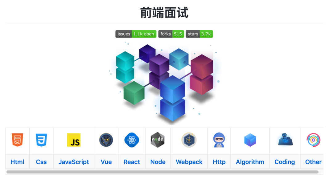 已经覆盖了 4000+ 道前端面试题,内容包括:HTML、CSS、JavaScript、Vue、React、Nodejs、TypeScript、ECMAScritpt、Webpack、Jquery、小程序、软技能。