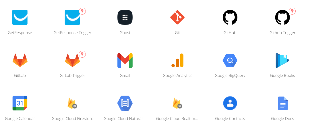 n8n 是国外的工作流自动化工具,集成的应用程序都是国外的产品,比如 Facebook、Airtable、Google doc 等等。显然,这款开源工具在国内没有使用场景,毕竟大部分国内的用户都是用本土的互联网产品。