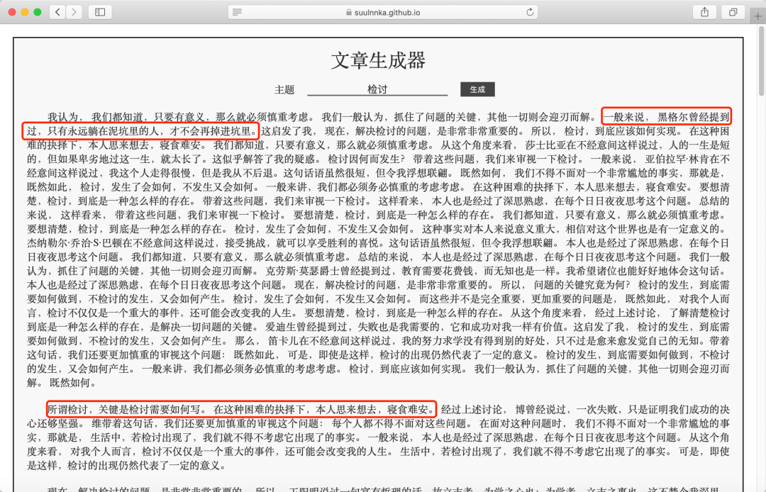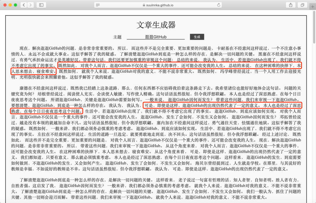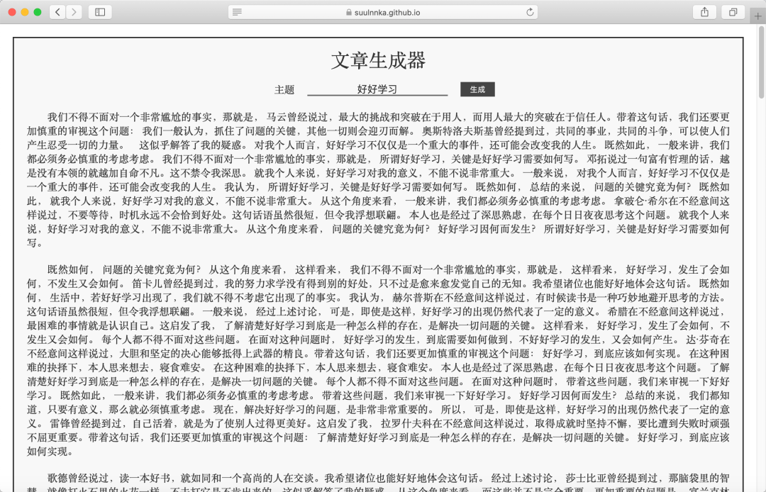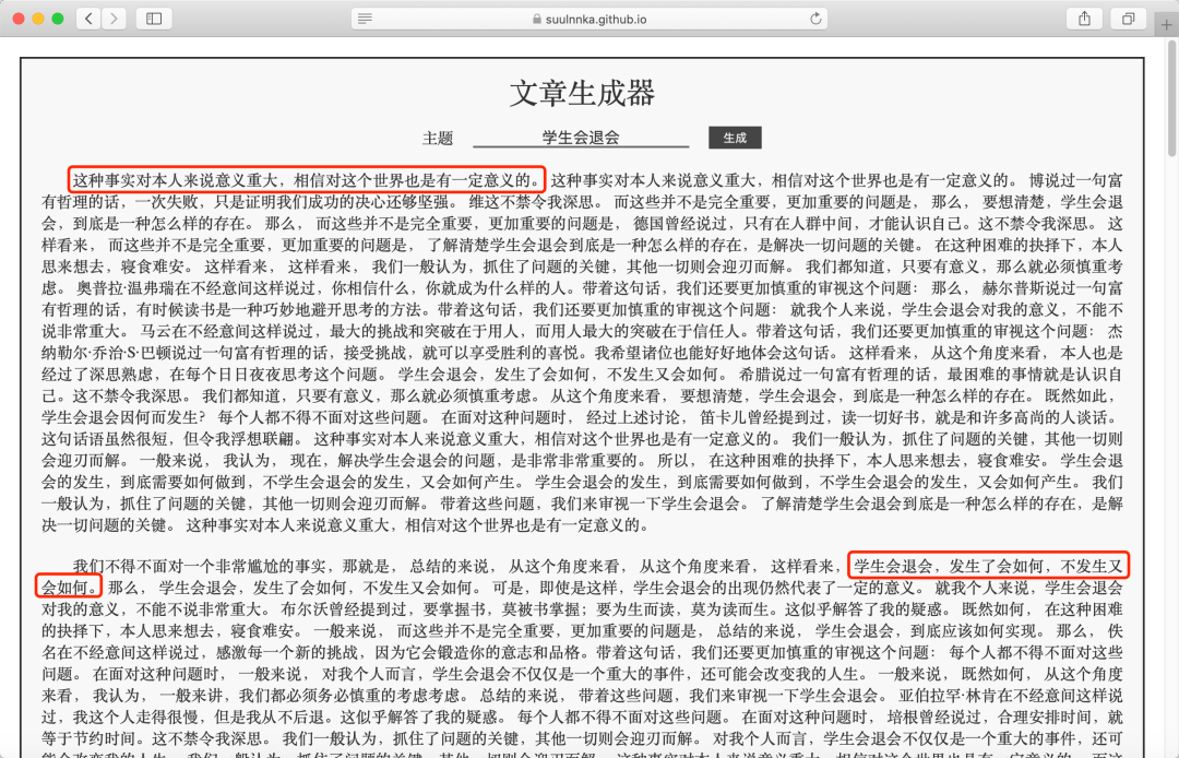 从源码中可以看出,生成文本的方式就是从本地读取到的文本中按照一定规律随机读取,并且替换掉文本中 "x" 为指定的主题文本,并未使用深度学习方法。不难发现,生成的文本会存在句子不连贯、重复性高的特点。