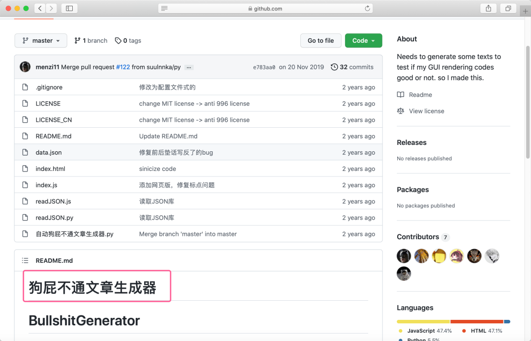 这个狗屁不通文章生成器项目最初的目的是用于中文文字 GUI 开发时测试文本渲染,用 Python 3 版本写成,目前共有 7 位贡献者。
