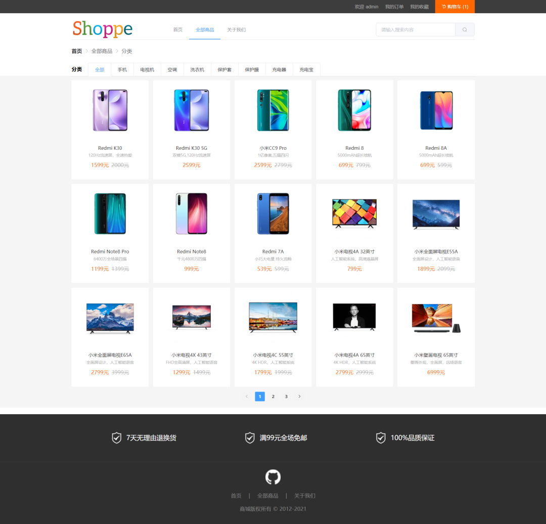 商城界面简洁,适配 PC 和移动端,系统整体色调为蓝色、白色,简约大方: