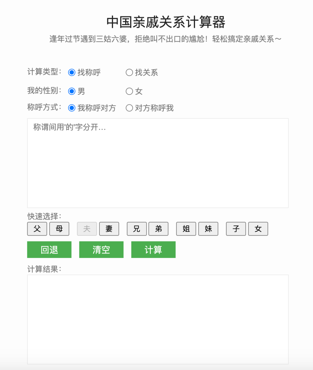 “中国家庭称谓计算器”为你避免了这种尴尬,只需简单的输入即可算出称谓。输入框兼容了不同的叫法,你可以称呼父亲为:“老爸”、“爹地”、“老爷子”等等,方面不同地域的习惯叫法。快捷输入按键,只需简单的点击即可完成关系输入,算法还支持逆向查找称呼哦。