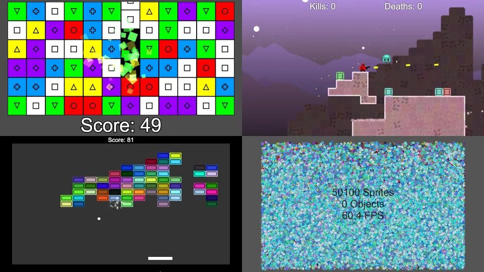 该引擎拥有制作高质量游戏所需的一切,包括快速渲染、物理、粒子、音效、音乐、键盘/鼠标/游戏手柄输入处理、更新/渲染循环和调试工具。🚂