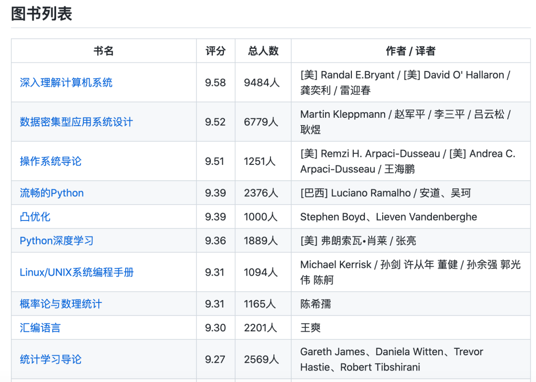 这个仓库时一个书单索引,综合了豆瓣 goodreads 综合评分的计算机书籍书单。该仓库包含计算机,互联网有关的几乎所有书籍,根据不同版本,两个平台的总评价人数和评分求出平均分,按从高到低排列。