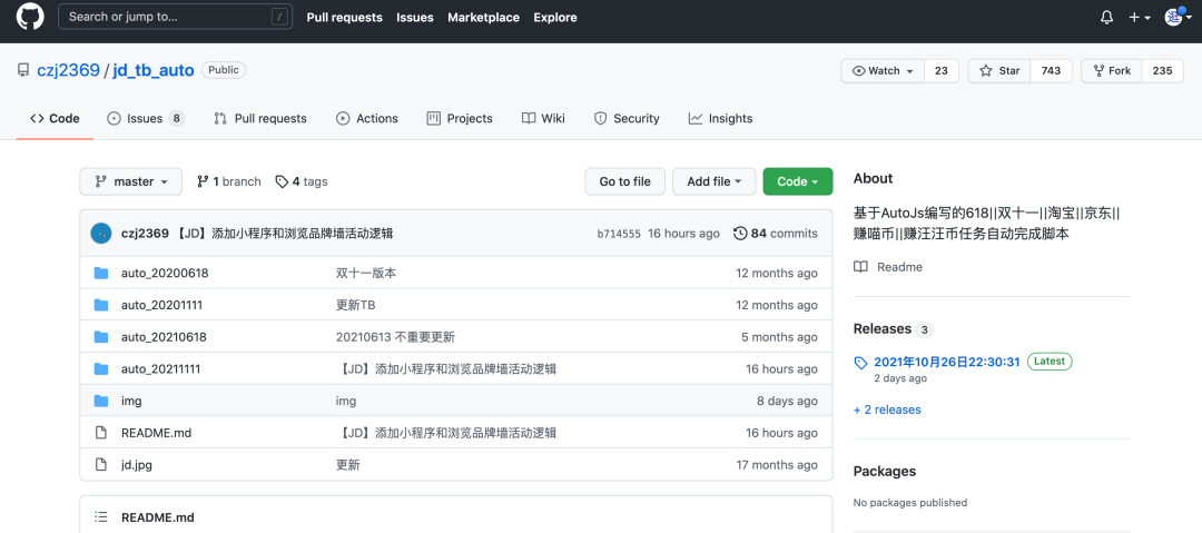任务脚本当你想完成一件重复劳动的事情,就先去 GitHub 去看看有没有黑科技。最近双十一大促,GitHub 上一个任务自动脚本登上了榜单,该项目是基于AutoJs编写的任务自动完成脚本,可以帮助你在 618、双十一、淘宝、京东、赚喵糖、赚汪汪币活动中崭露头角。
