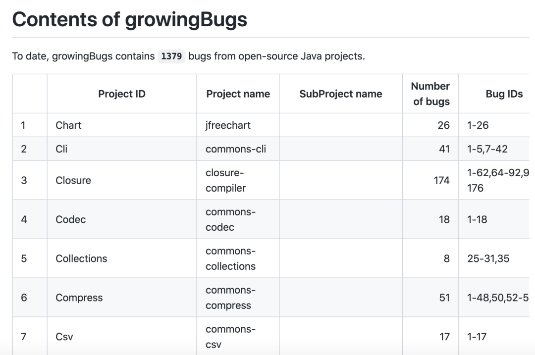 一个不断增长的 bug 存储库,称为 GrowingBugs。在这个厂库中,每个错误都由一个错误版本、一个修复版本、一个简洁的补丁(仅限错误修复更改)和一个或多个触发测试用例组成。