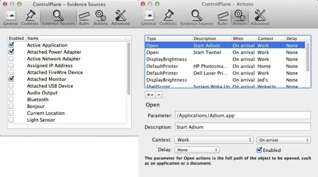 诸如此类,各种设置翻来覆去的调整很是麻烦,于是就有了 ControlPlane 这种系统设置适配软件。添加规则自定义各种情境模式,可以根据电源、网络适配器、时间的变化自动激活各种规则,用来切换 IP、调节屏幕亮度、关闭蓝牙、静音等。