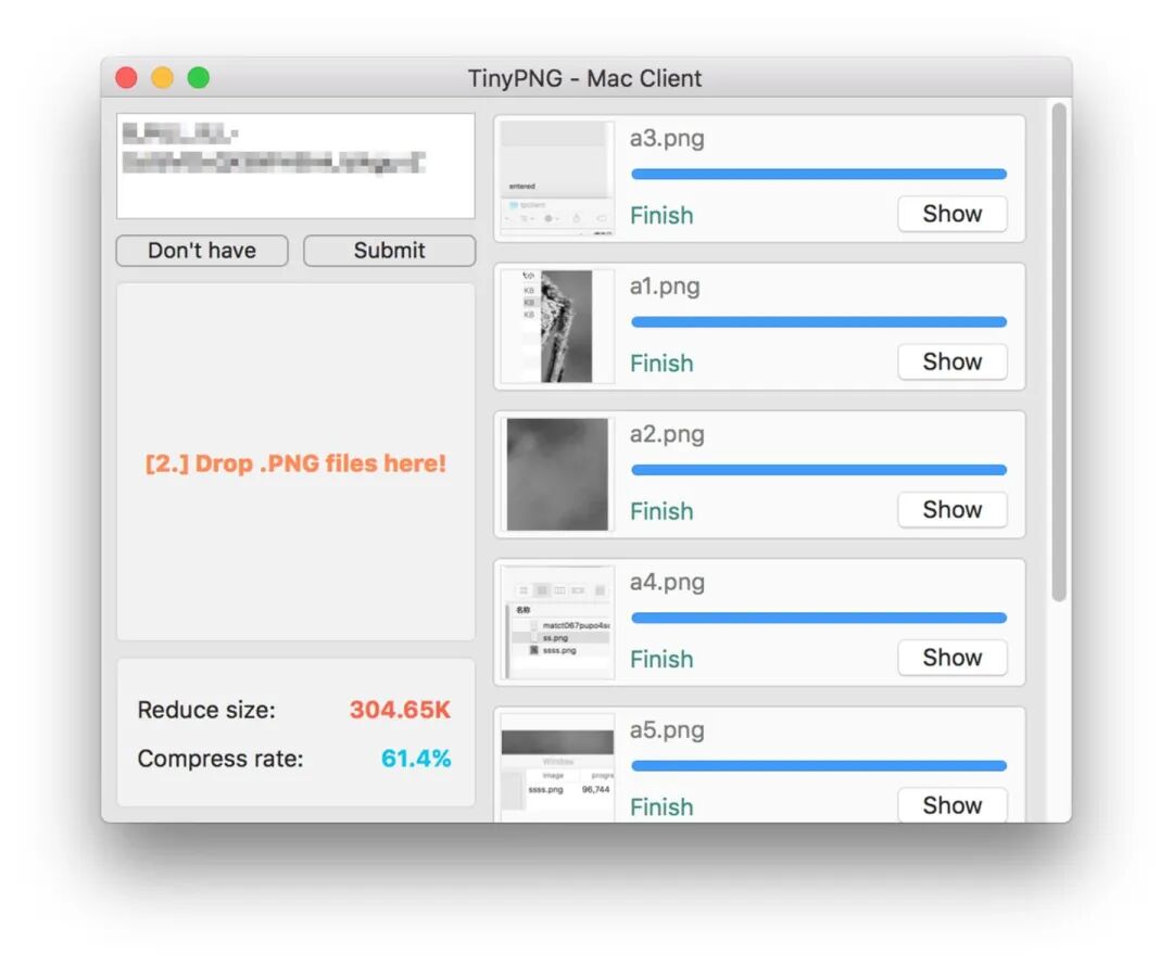 TinyPNG 是一个专注 png 图片压缩的网站,平均压缩比例能达到70%,同时对于图片质量的损失几乎为 0 。TinyPNG4Mac 是 TinyPNG 服务的 Mac 客户端。首次使用需要到 TinyPNG 申请一个秘钥,需要填个邮箱和用户名即可,秘钥会自动发到邮箱。