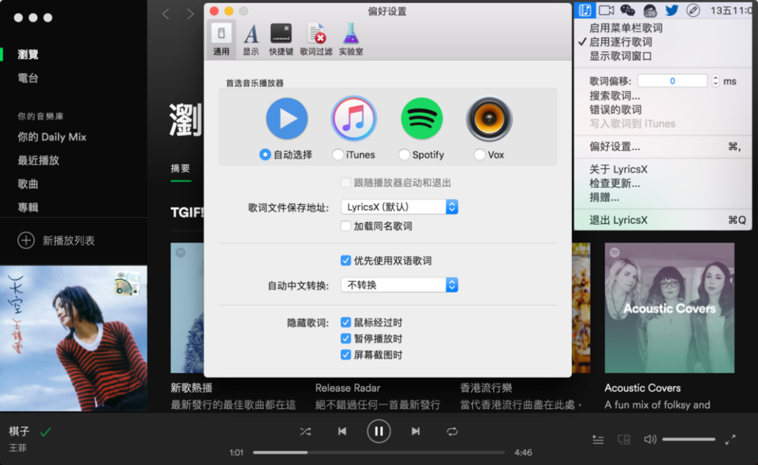 自动匹配和下载歌词,并在在桌面和菜单栏上显示,歌词源支持网易云音乐、QQ 音乐、虾米、酷狗等。