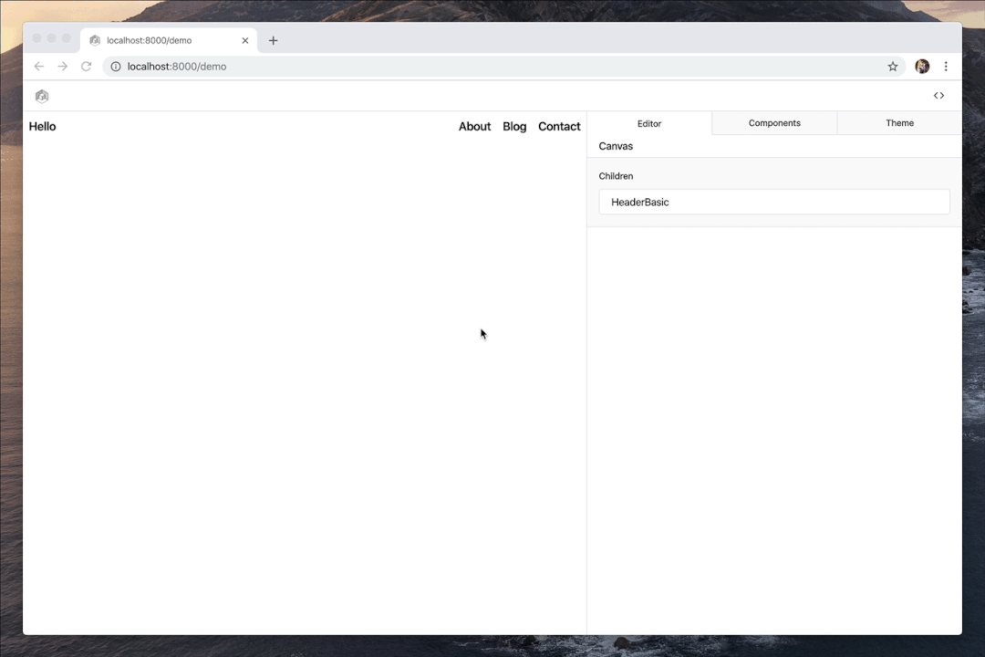 import React from 'react'import Editor from 'blocks-ui'const JSX = `import React from 'react'import { HeaderBasic } from '@blocks/react'export default () => ( <Blocks.Root> <HeaderBasic> <HeaderBasic.Logo to="/">Hello</HeaderBasic.Logo> <HeaderBasic.Nav> <HeaderBasic.Link to="/about">About</HeaderBasic.Link> <HeaderBasic.Link to="/blog">Blog</HeaderBasic.Link> <HeaderBasic.Link to="/contact">Contact</HeaderBasic.Link> </HeaderBasic.Nav> </HeaderBasic> </Blocks.Root>)`export default () => <Editor src={JSX} />