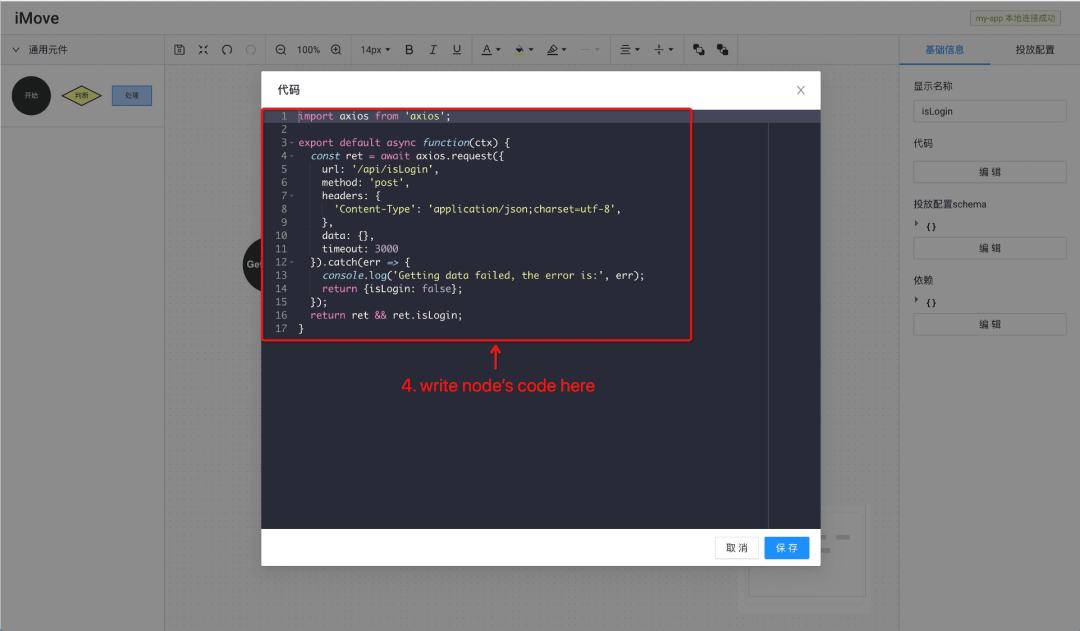 iMove由 2 部分组成:画布和 imove-sdk。通过本地起一个 HTTP 服务运行画布,在画布上完成代码编写和节点编排,最终将流程导出 dsl,放到项目中,通过 imove- SDK 调用执行。