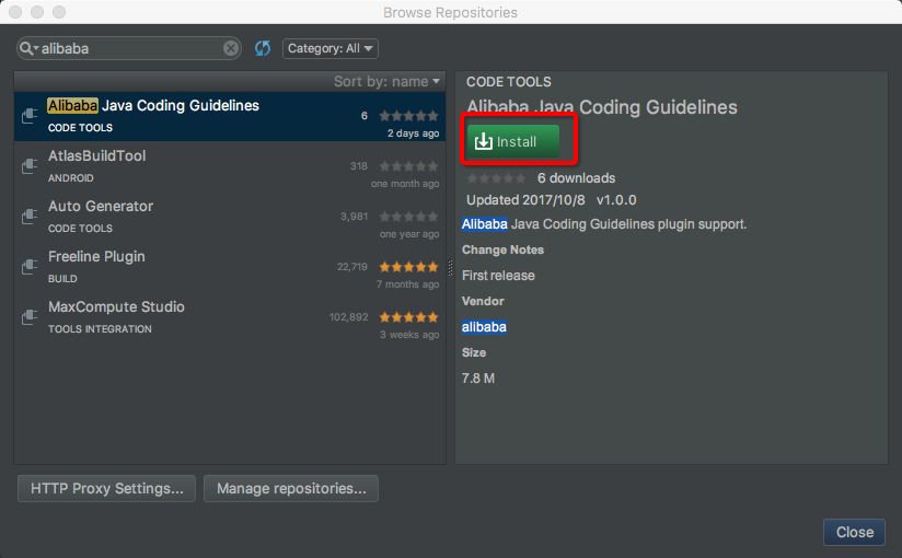 以 IDEA 为例,在搜索框输入 alibaba 即可看到 Alibaba Java Code Guidelines 插件,点击 Install 进行安装,然后重启 IDE 生效。