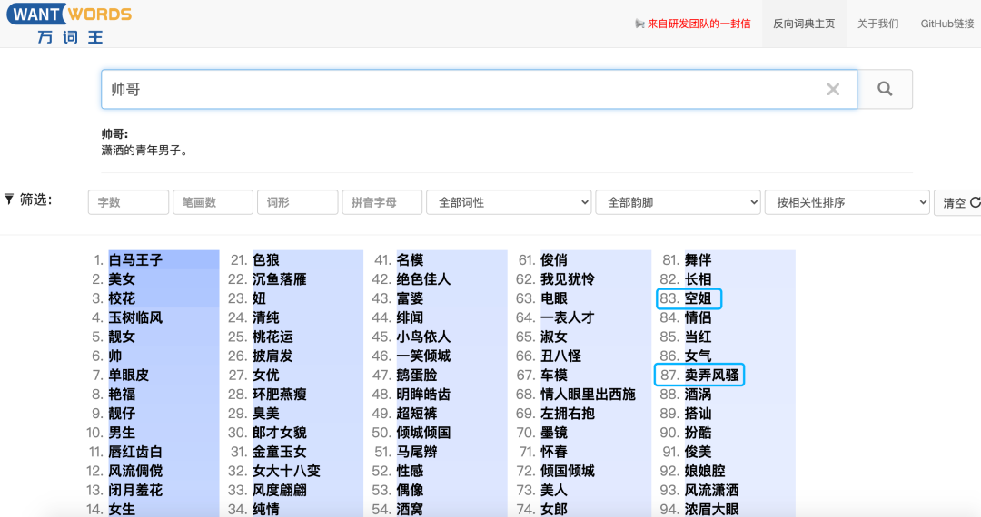 当你输入「帅哥」关键词,算法就会生成白马王子、玉树临风、一表人才等等。