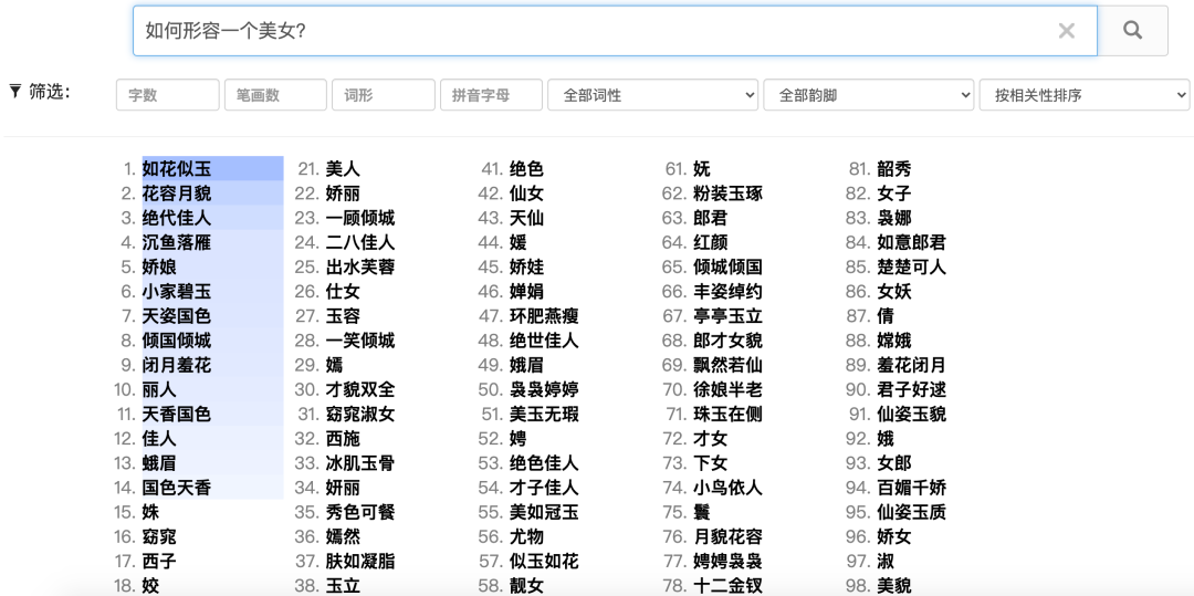 当你输入「如何形容一个美女?」关键词,算法就会生成它认为你应该如何描述。比如:如花似玉、花容月貌、绝代佳人。