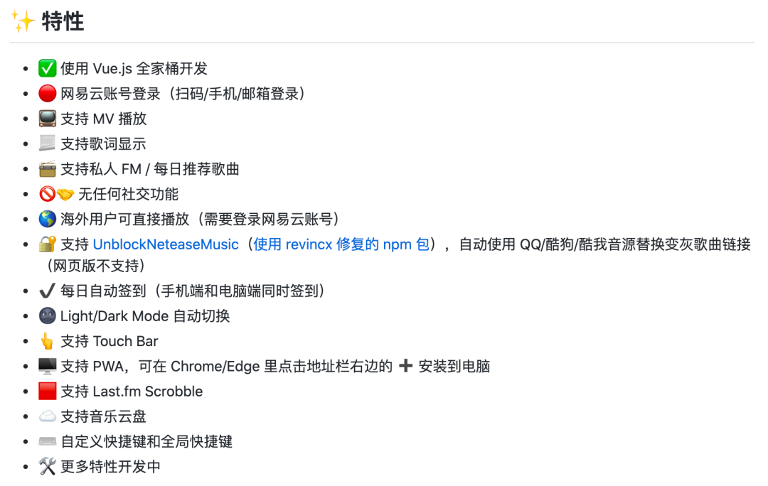 支持网易云账号登录、MV 播放、无任何社交功能、显示歌词、暗色模式等功能,最重要是比官方客户端好看许多,支持 Windows、macOS、Linux。