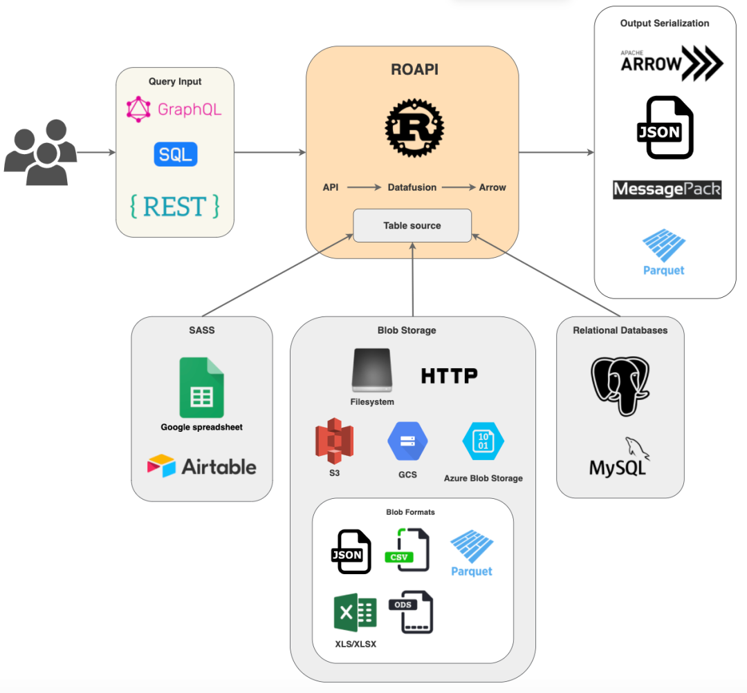 一个工具 roapi,能为静态数据快速的生成可读的开放 API,其中 API 的查询形式支持种类非常多,比如 rest API、SQL 查询、GraphQL。下图就是工具 roapi 的整体的交互流程图。