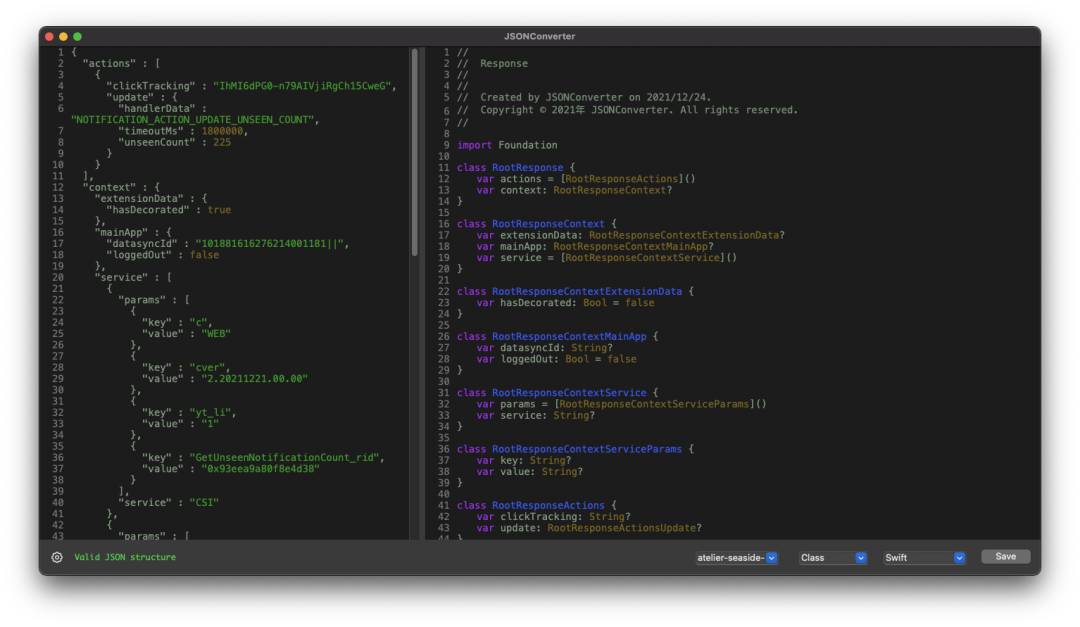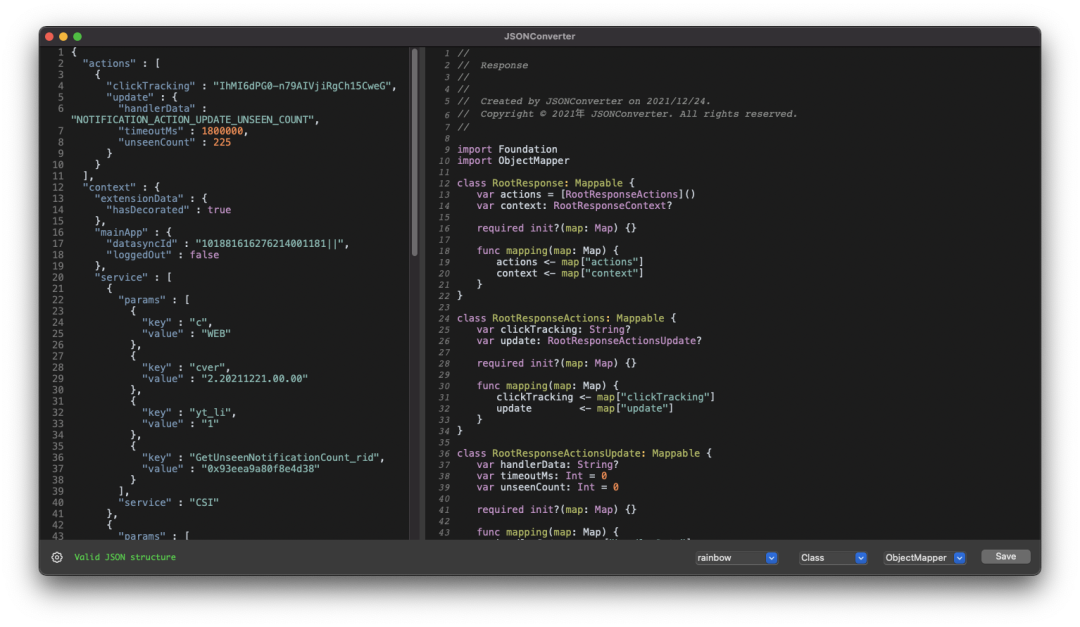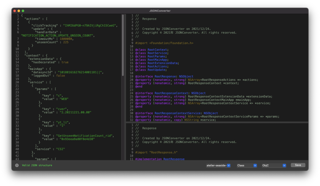 JSONConverter 是 MAC 上 iOS / Flutter / Android / Server 等开发的辅助工具,可以快速的格式化 JSON 数据并转换生成对应的模型类属性。