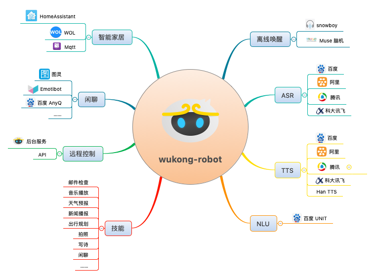 上图是悟空机器人的功能模块图,悟空机器人包含众多模块,比如智能家居、闲聊、运程控制、技能、NLU、离线唤醒等等。
