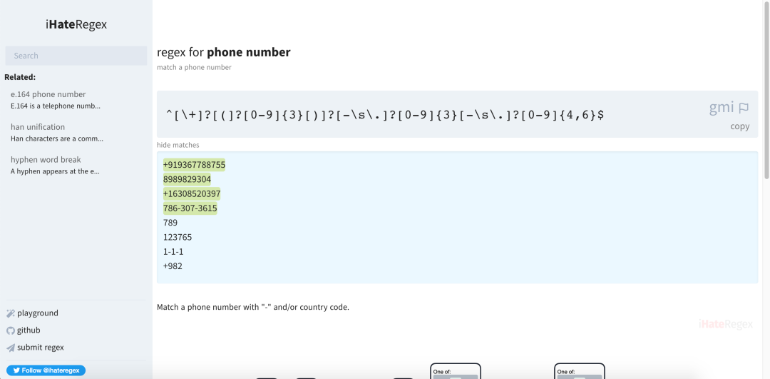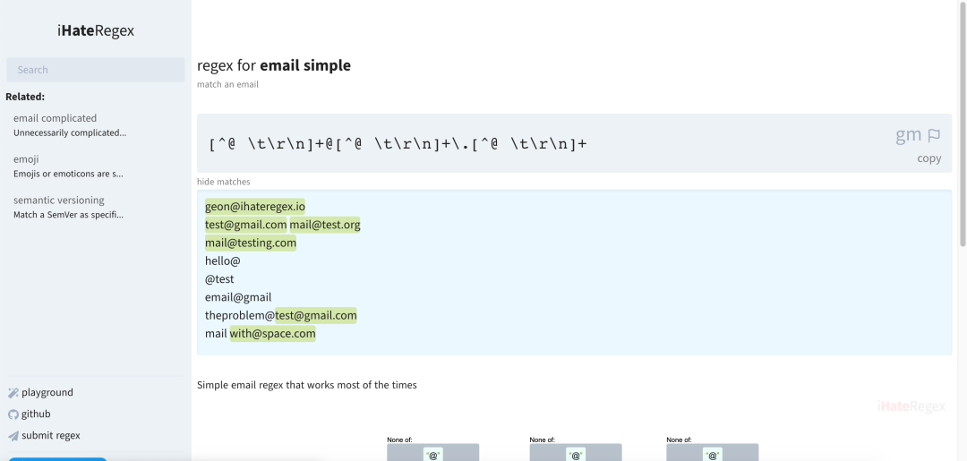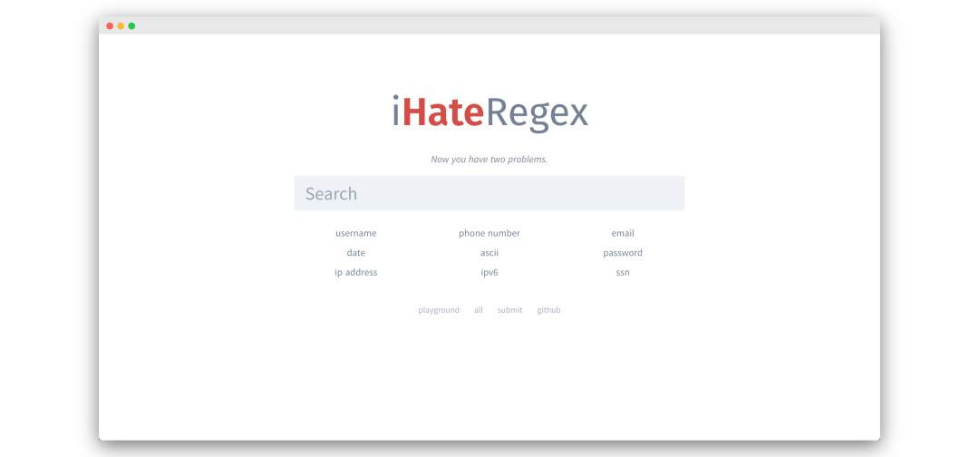 今天推荐一个开源项目,叫做:I hate regex。开源作者痛恨正则,决定搞一个正则表达式备忘录,开发了一个正则表达式搜索网站。