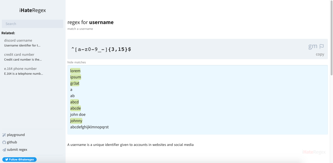 比如你搜索 username,就会显示 username 适用的正则表达式。