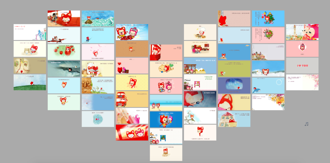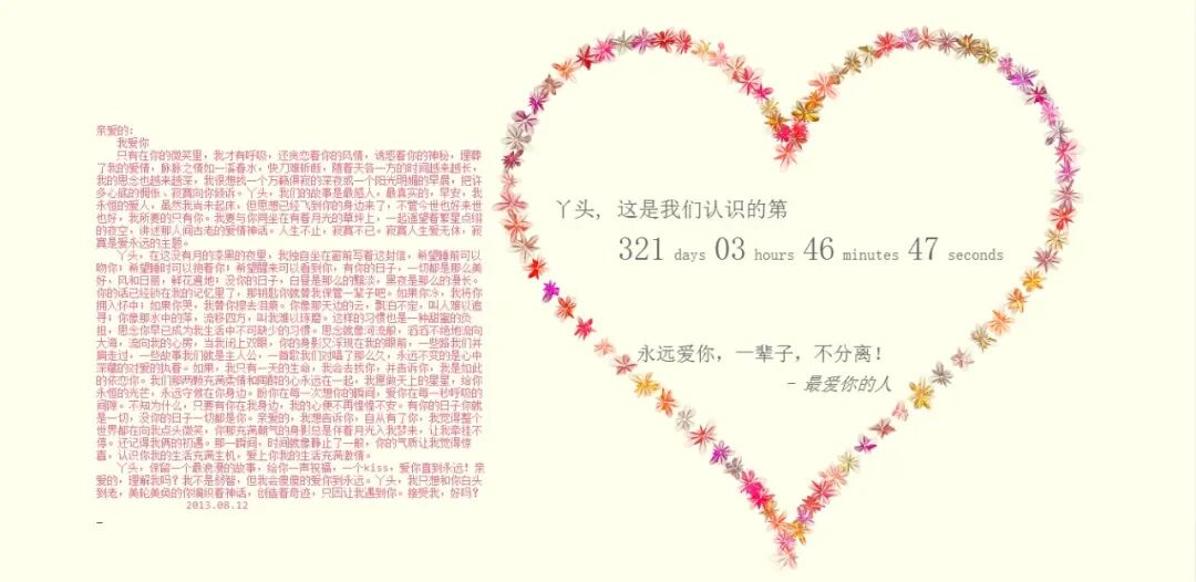 这是一个情侣的照片墙,刚开始会从从第一张照片开始进行展示。你通过按向下的箭头↓不断切换照片。最终所有照片拼成心形的照片墙。