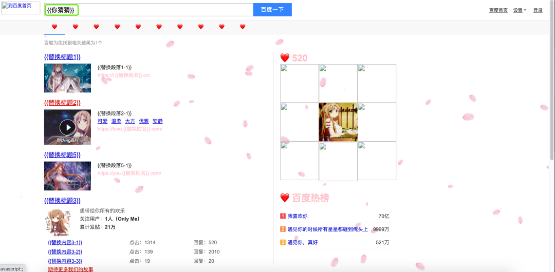 这是一个用来表白的高仿百度。当你点击百度一下,便会展示你准备好的动画,最终进入的检索结果网页的内容也都是可以配置的。