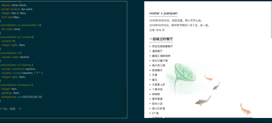 比如你在左侧加了一行更改北京颜色的代码,网页会实时的改变样式。整体效果就是左侧一行行代码出现,右侧出现一行行对 TA 说的话,并且样式变得逐渐好看。