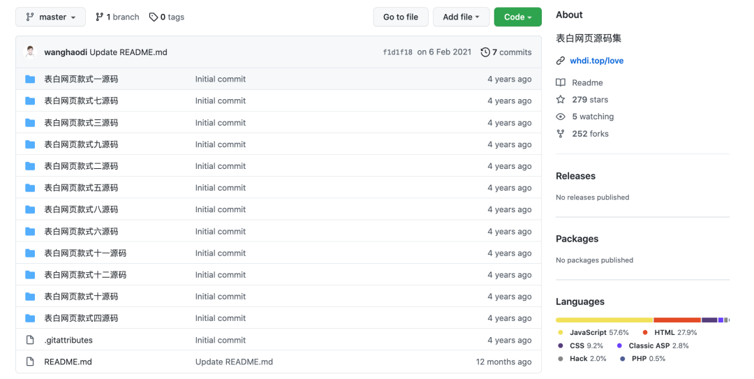 这个开源项目包含 12 套表白网站的源码,都是使用HTML、CSS、JS 写的。你只需要简单修改里面的内容,就能快速搭建一个表白的网页。