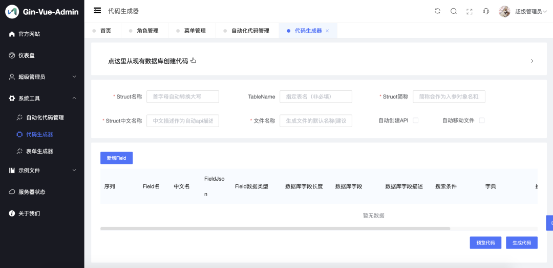 基于 vite + vue3 + gin + Go 搭建的开发基础平台,集成 jwt 鉴权,权限管理,动态路由,分页封装,多点登录拦截,资源权限,上传下载,代码生成器,表单生成器等开发必备功能,五分钟一套 CURD 前后端代码。