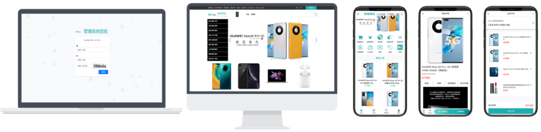 商城界面简洁,适配 PC 和移动端,系统整体色调为蓝色、白色,简约大方: