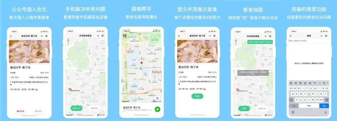 小程序的功能包括:基于地图和位置的查找店铺、完整的搜索支持、提供完整店铺列表功能、提供移动端的管理功能、提供公众号插入支持、提供店铺导航能力、添加到我的小程序提醒下。