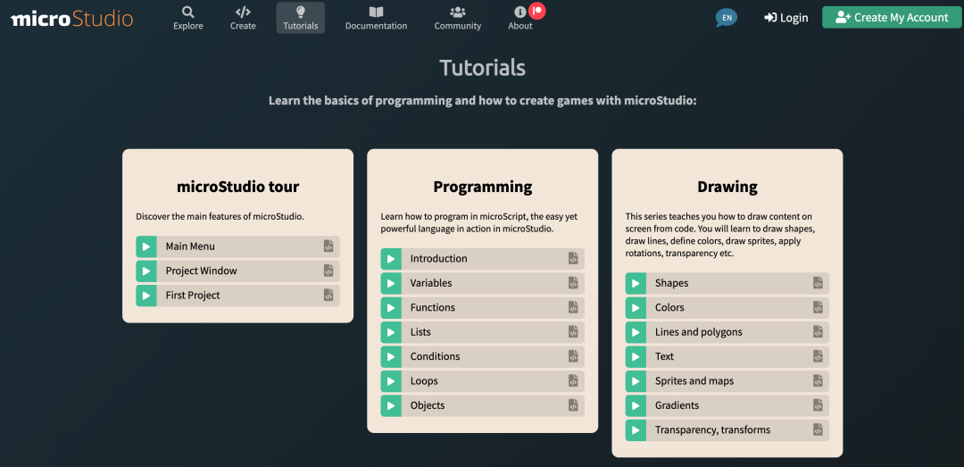 你可以在浏览器中访问 microStudio.dev 开始搭建你的游戏,当然你可以克隆现有项目或创建新游戏并开始编码,无需创建帐户。