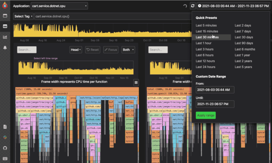 Pyroscope 可以存储来自多个应用程序的多年剖析数据,支持一次查看多年的数据或检索查看特定的事件数据,还有丰富炫酷的图表展示。