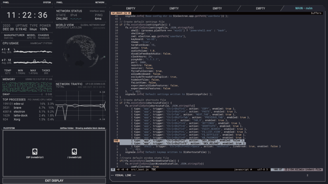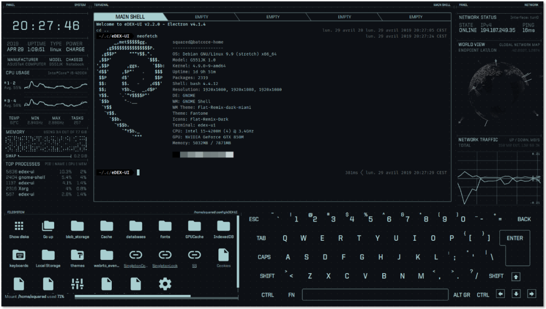 eDEX-UI 是一款跨平台基于 Electron 的炫酷终端工具。好莱坞级别的终端使用体验,拥有漂亮的启动动画、浮夸的音效,还能够直观地展示文件目录、系统资源、网络等信息。支持实时系统和网络监控、触摸式显示器,还可以修改主题、屏幕键盘布局和CSS进行高级定制。