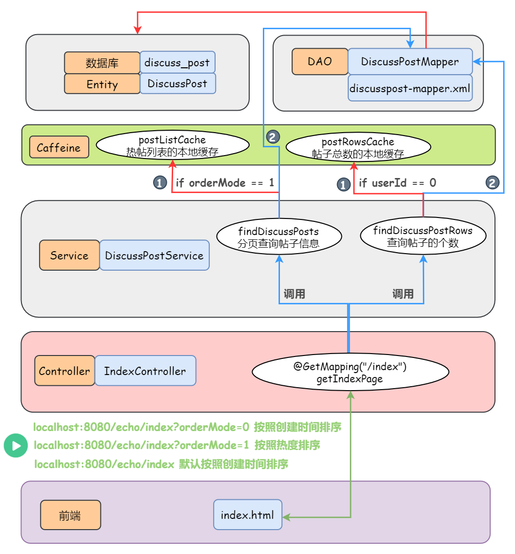 将热帖列表和所有帖子的总数存入本地缓存 Caffeine(利用分布式定时任务 Spring Quartz 每隔一段时间就刷新计算帖子的热度/分数 — 见下文,而 Caffeine 里的数据更新不用我们操心,它天生就会自动的更新它拥有的数据,给它一个初始化方法就完事儿)