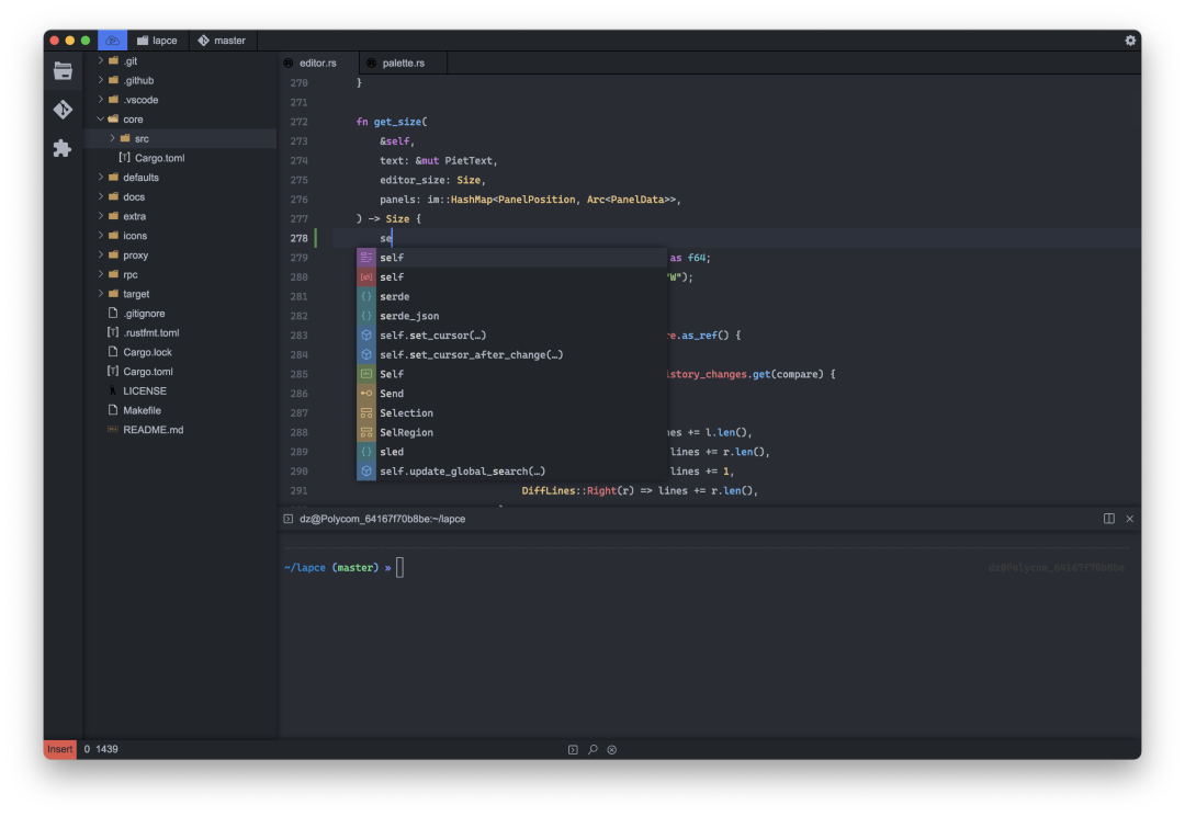 这是一个基于 Rust 的代码编辑器,非常轻量级号称闪电般的速度。该编辑器的 UI 基于 Druid,它使用了 Xi Editor 的 Rope Science 进行文本编辑,并使用 Wgpu 进行渲染。