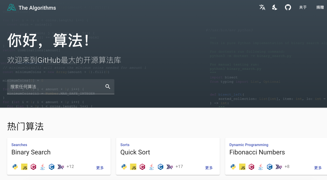 号称 GitHub 上最大的开源算法库。这个开源项目标是使用代码来记录、开发美观的、有用的和有趣的算法。编程语言涉及:Java、Python、Js 等。