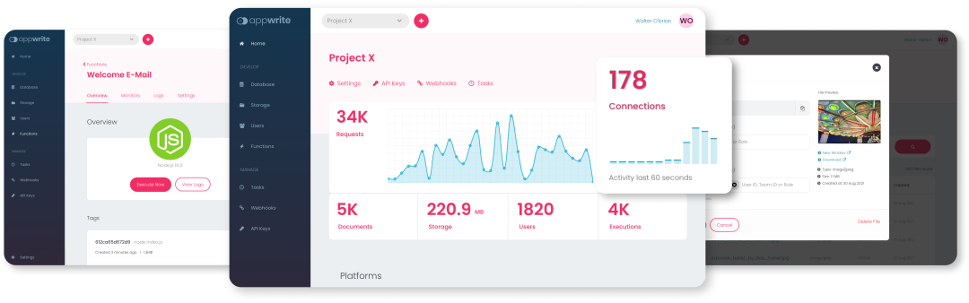 Appwrite 是一个基于 Docker 的端到端开发者平台,其容器化的微服务库可应用于网页端,移动端,以及后端。Appwrite 通过视觉化界面极简了从零编写 API 的繁琐过程,在保证软件安全的前提下为开发者创造了一个高效的开发环境。