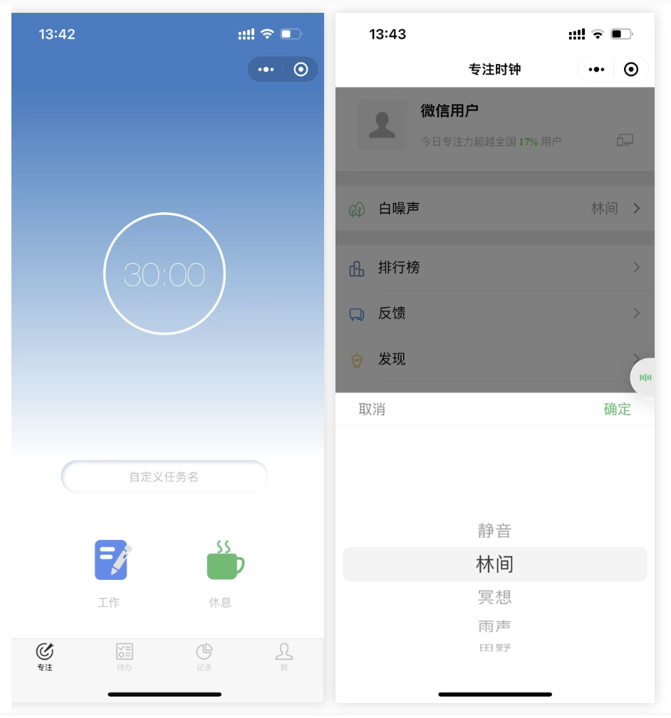 除此之外,在你工作期间还能选择播放背景音乐,比如林间、鸟语,听着这些清淡轻松的声音,仿佛真的能够让你静下心来。