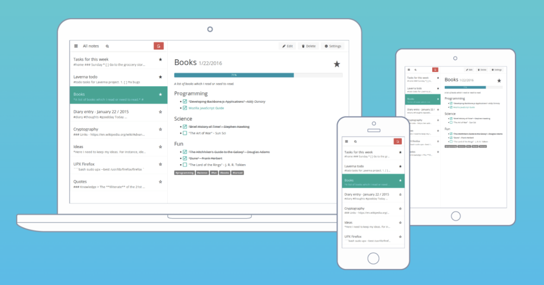Laverna 是一个带有 Markdown 编辑器和加密支持的 JavaScript 笔记 Web 应用程序,GitHub 标星 8.8 K。可以作为 Evernote 的开源替代品。