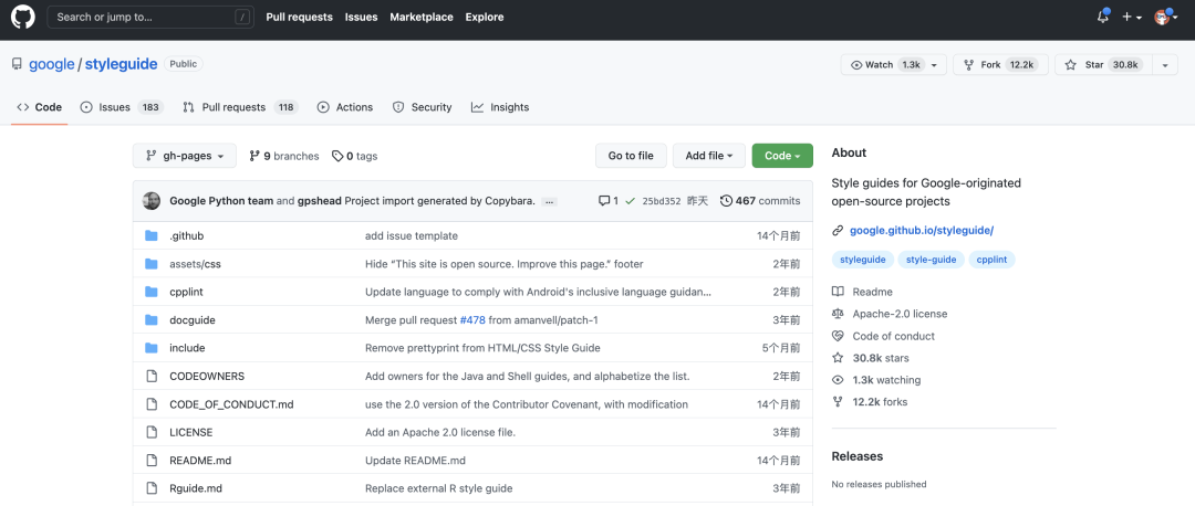 “风格”涵盖了很多方面,从“使用驼峰式命名变量名”到“从不使用全局变量”到“从不使用异常”。这个开源项目是一个索引页,可以帮你快速了解 Google 开源项目的风格规范。