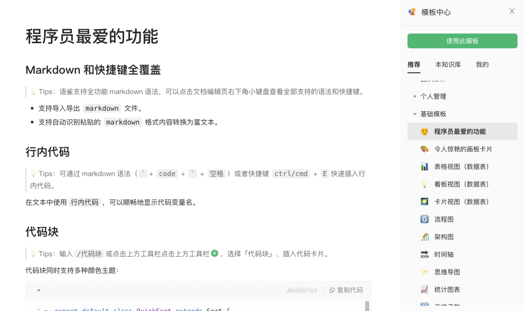 最初就是作为一款 “程序员写给程序员用”的工具。除了一些功能上的支持,也可以在官方的模板中心查看程序员最爱的功能。