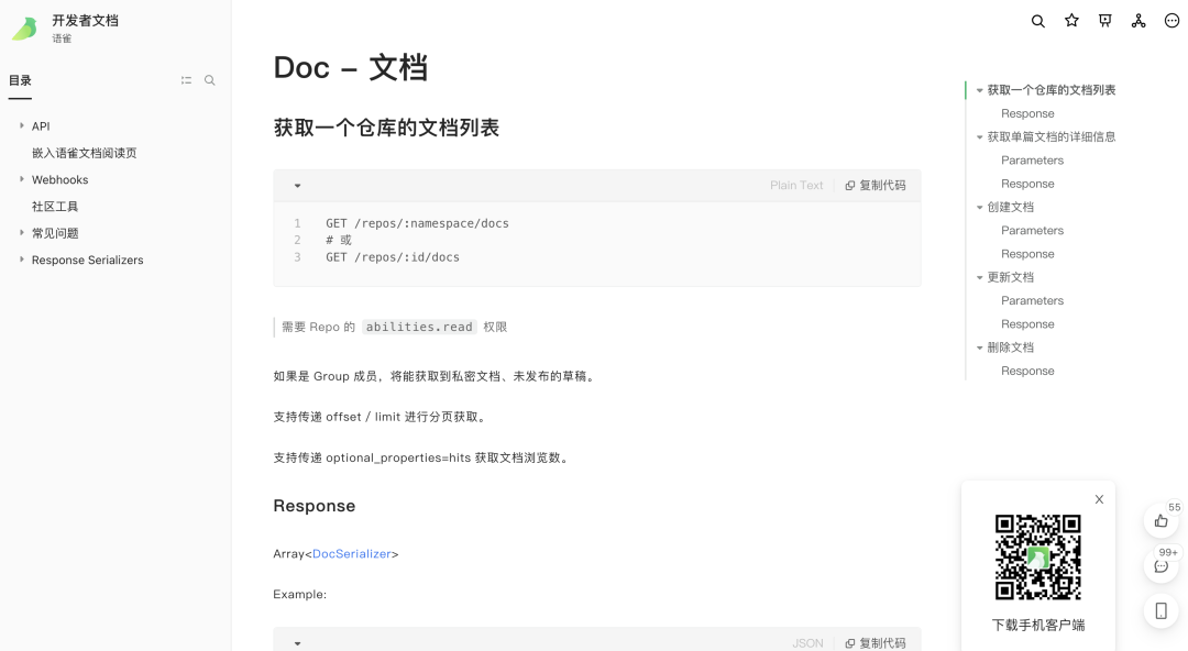 对于开发者,语雀提供了开放的 API 接口,这样程序员就能基于开放 API 开发来满足自己个性化的需求。
