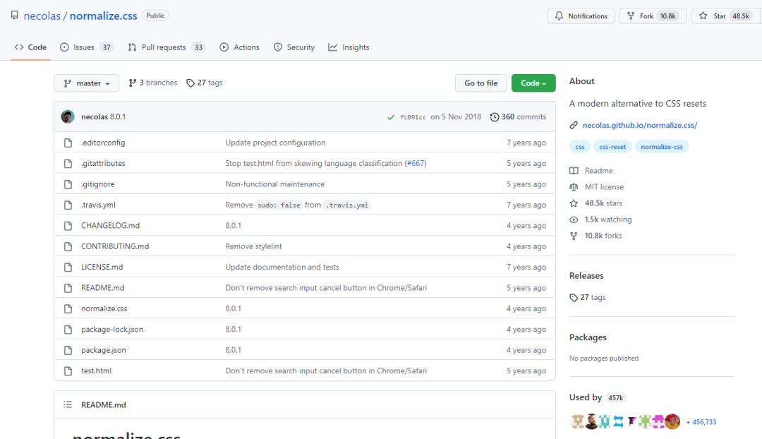 如果想让不同的浏览器在渲染网页元素的时候形式更统一,Normalize.css 是一个不错的选择,这个开源项目在 GitHub 上斩获 48.5k 的 Star。