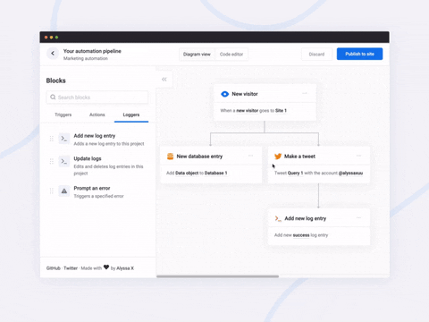 /* 在你的 Web 项目引入 flowy.min.js 和 flow.min.css */<link rel="stylesheet" href="https://cdn.jsdelivr.net/gh/alyssaxuu/flowy/flowy.min.css"> <script src="https://cdn.jsdelivr.net/gh/alyssaxuu/flowy/flowy.min.js"></script>/* 引入 create-flowy 类就能创建可拖动的 block */<div class="create-flowy">The block to be dragged</div><div id="canvas"></div>