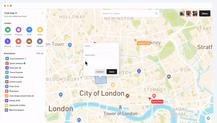 通过实时协作,你可以与其他用户同步计划和行程;你能使用画笔或者箭头在地图上标记和注释;还可以创建一些标记,方便快速定位标注地图上的位置,同样可以把地图数据导出。