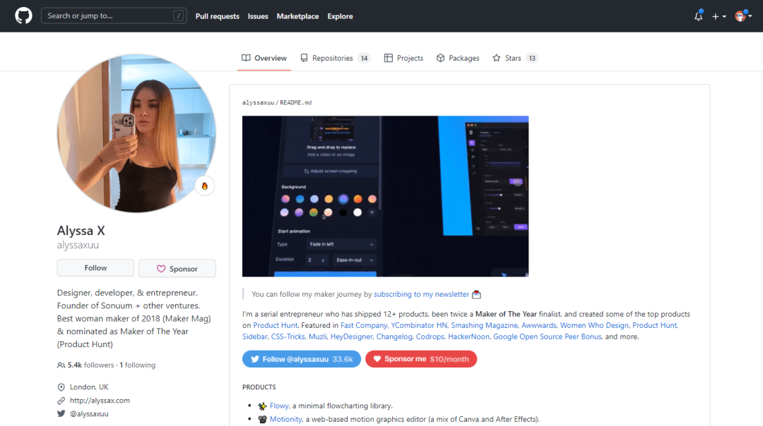 推荐一位国外全栈开发者大神:Alyssa,在 Github 上有 5.34K 的关注者。她是一名全栈开发者、Sonuum 公司的创始人。