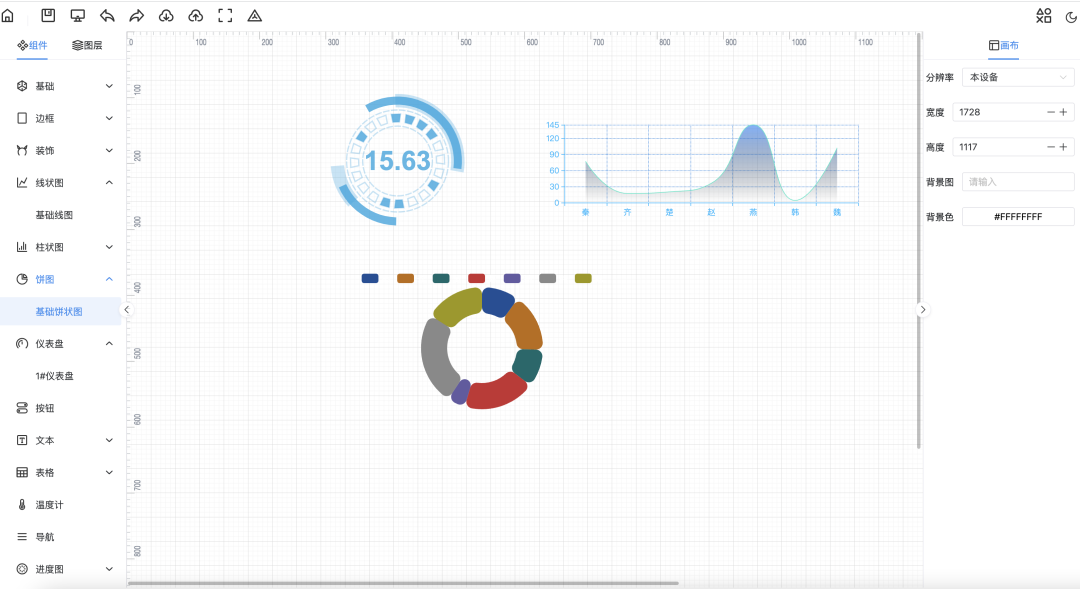 和很多低代码平台一样,左中右分别对应组件、画布、属性。通过拖拉拽的交互,将组建拖动到画布区域,并且可以调节各种图表的属性,比如颜色、字体大小等等。