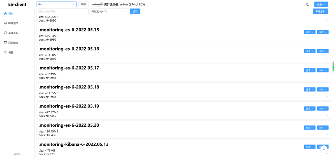 elasticsearch 的客户端比较出名的就是 elasticsearch head 和 Kibana,但是 elasticsearch head 已经停止更新,且样式老旧,功能不全;而 Kibana 虽功能全面,但是启动麻烦,大部分功能用不上,很不灵活,所以采用 vite2 + vue3 + ts + element-plus 进行开发了一个 elasticsearch 的客户端。