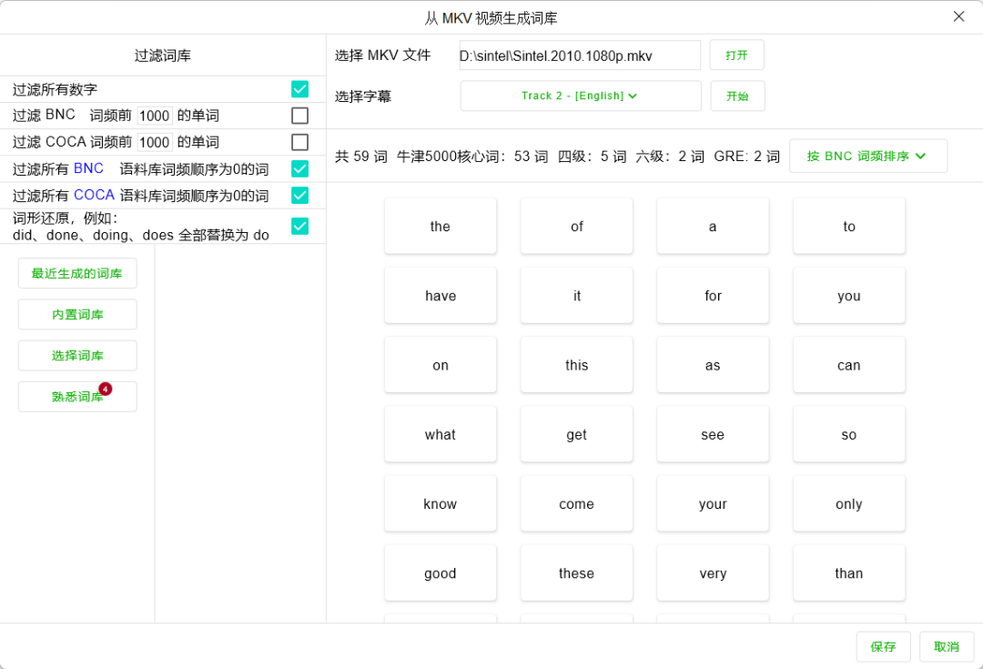 如下图所示,你选择一个 MKV 文件后,就能将该视频的中的字幕生成一个词库,还能够标注出这些词汇属于六级还是牛津等等。